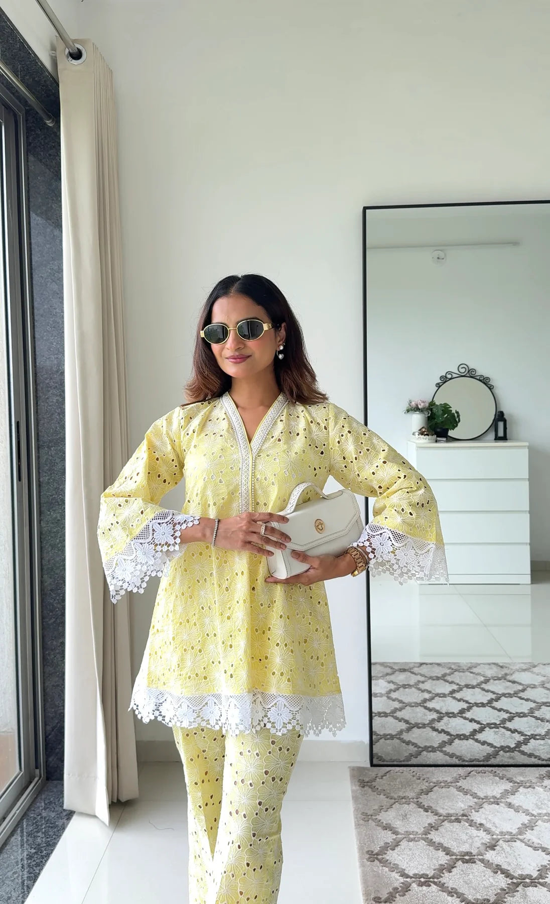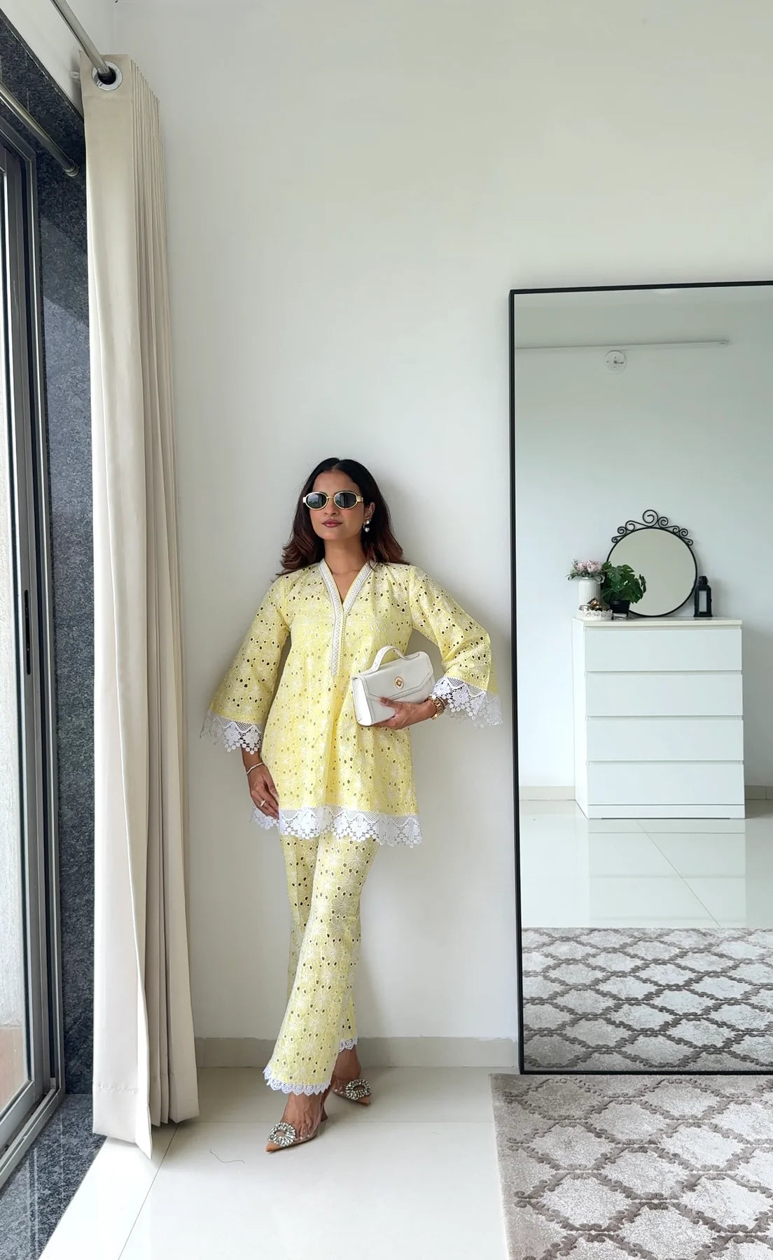 Elevate your festive wardrobe with this effortlessly chic coord set, thoughtfully crafted for comfort and style. Made from breathable, soft cotton, this set features delicate cutwork detailing paired with elegant lace accents—bringing subtle sophistication to your everyday celebrations.