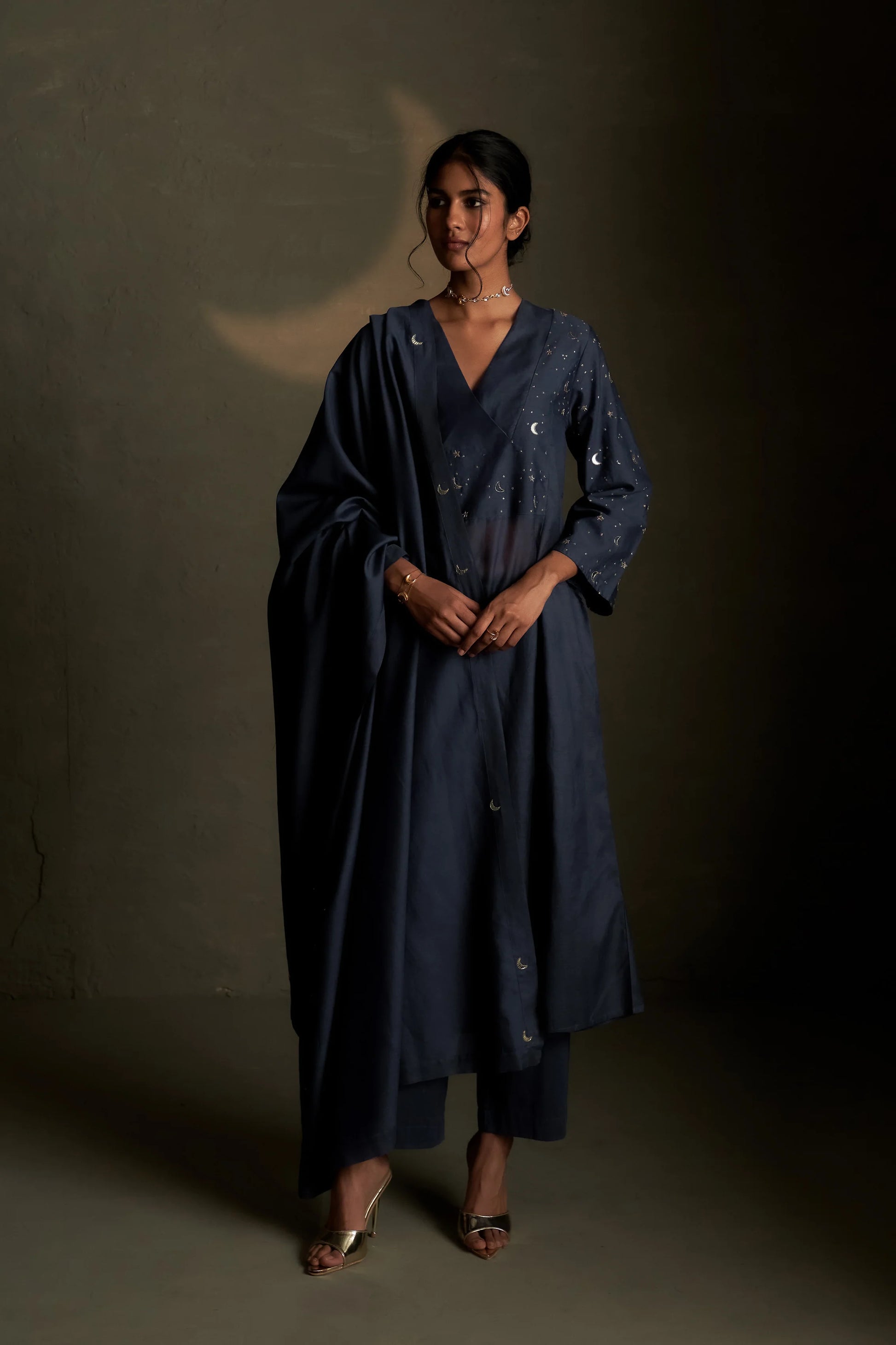 This kurta set blends classic elegance with celestial charm. The broad placket kurta is adorned with subtle star motifs and a crescent moon crafted in real glass, standing out beautifully against the delicate starry night embroidery on the neckline and sleeves. Paired with comfortable palazzos, it comes with a soft mul dupatta featuring crescent moons in glass placed all along the edge with scattered star motifs at some places , adding a graceful touch of festive sparkle.