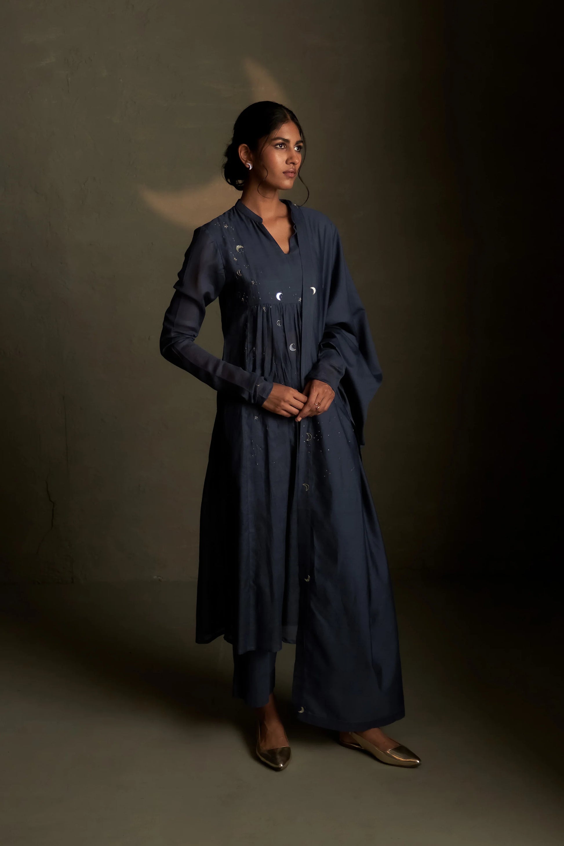 Straight from our Chandni Raatein collection, this long kurta with front yoke along with soft gathers and subtle churidar sleeves is paired with palazzo pants that captures the allure of the night sky. Star and moon embroidery is thoughtfully placed across the kurta to evoke the feel of distant galaxies, while a soft mul dupatta with crescent moon embroidery all around the edge completes the look. Elegant, festive, and timeless, it’s the perfect ensemble for the season.