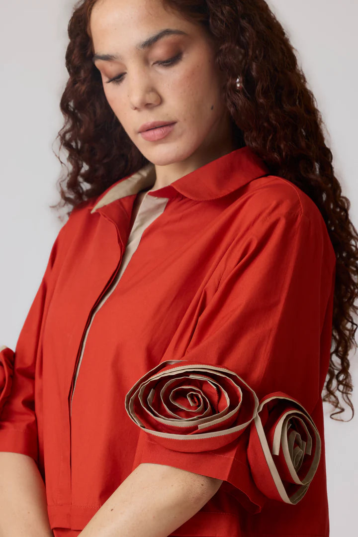 DESCRIPTION: A modern twist on the classic shirt dress with statement handcrafted two toned fabric roselle on sleeves.