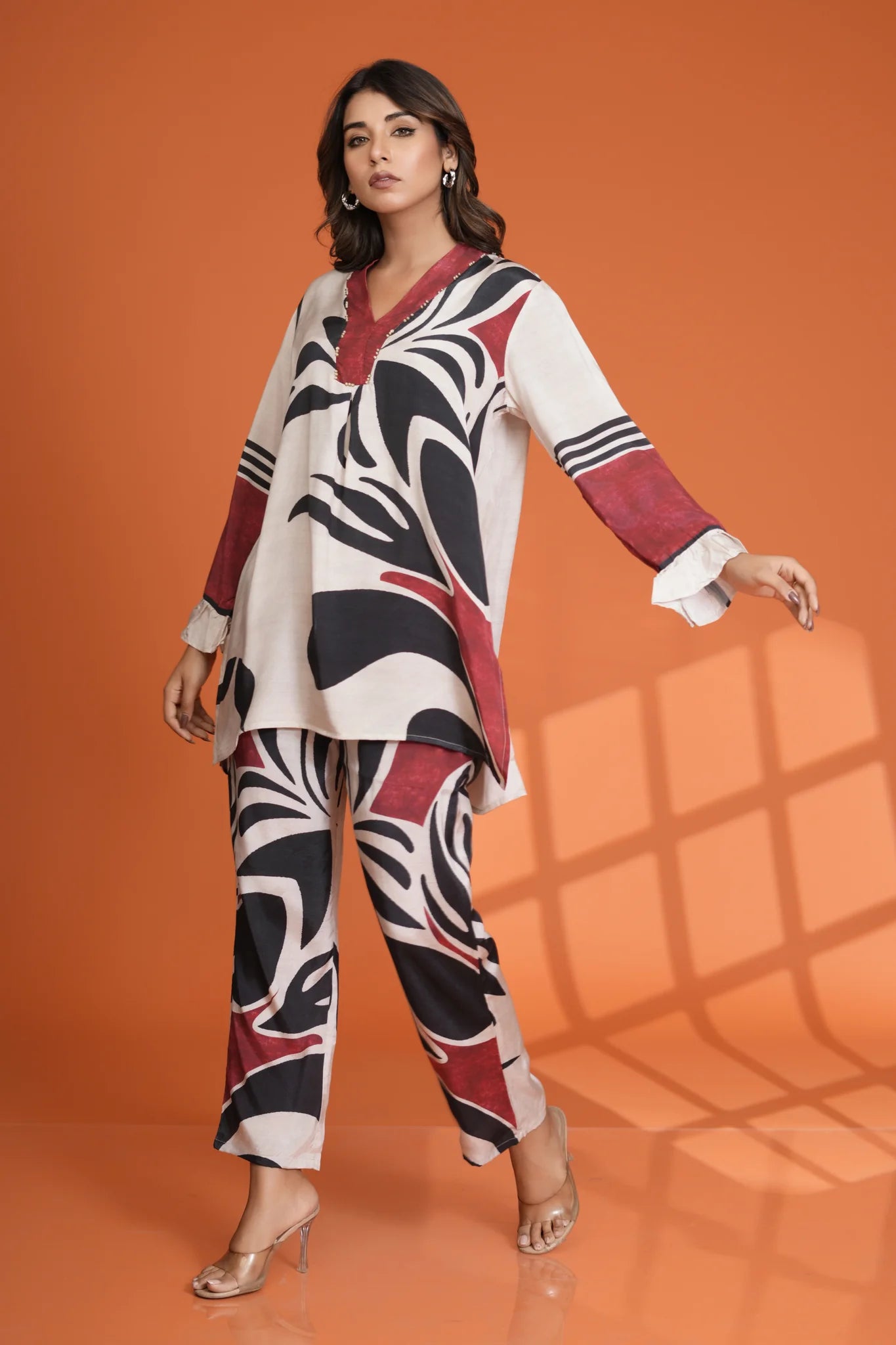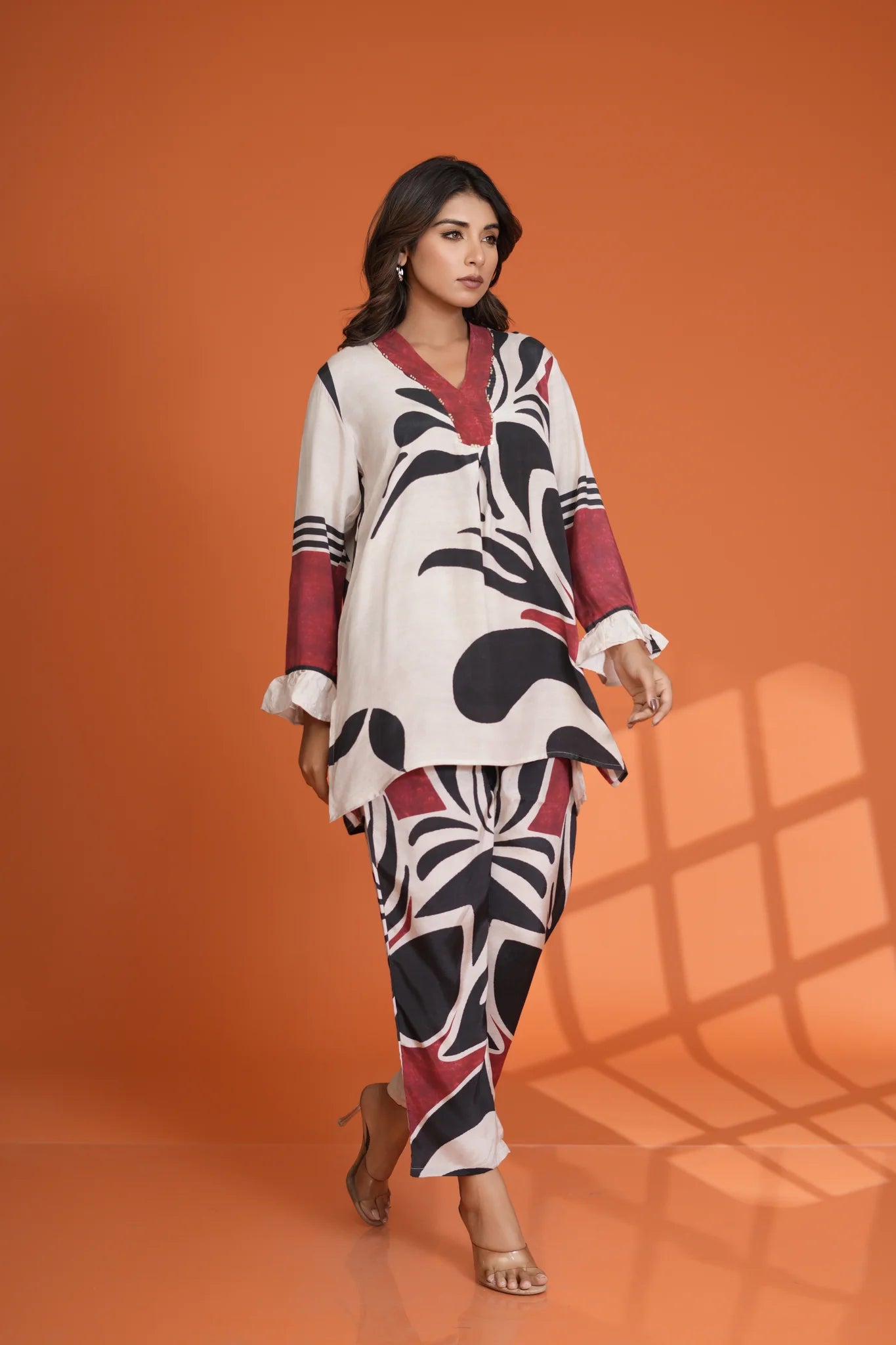 Cream Base Bold Placement Printed V-Neck Co-Ord Set in Muslin