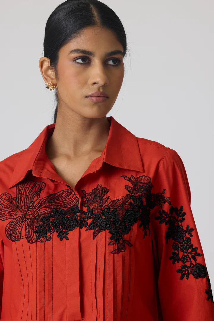 DESCRIPTION: A sharply crafted shirt dress with hand pleating down the front bodice and delicate lace detail hand stitched onto the front yoke. Comes with same fabric belt for those who want a more cinched look