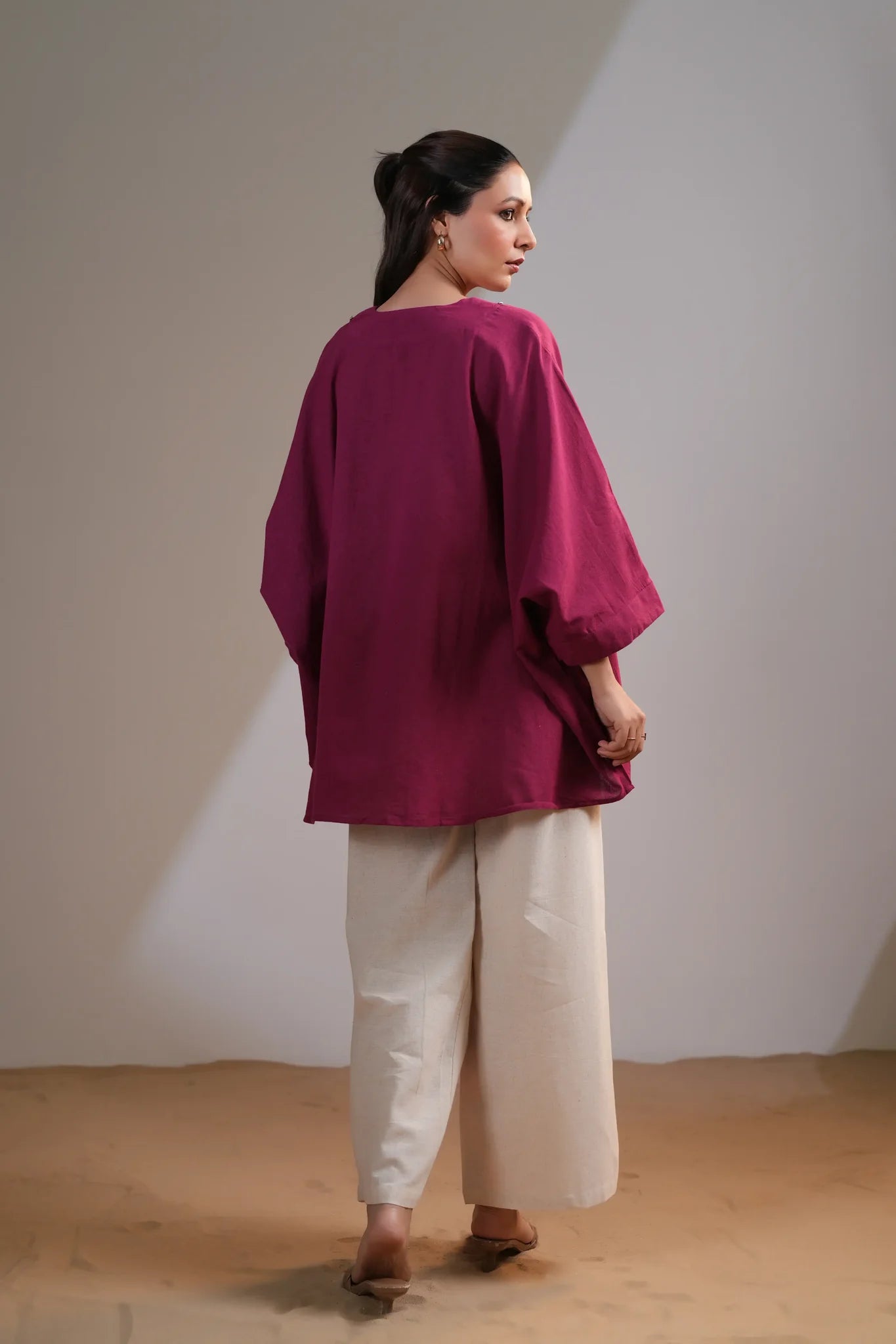 Make a striking statement with this Magenta Pink Co-Ord Set, designed to exude effortless sophistication. Featuring a silver-embellished V-neck top and placement-embroidered wide-leg pants, this ensemble is crafted from soft and breathable cotton flex, ensuring all-day comfort without compromising on style.