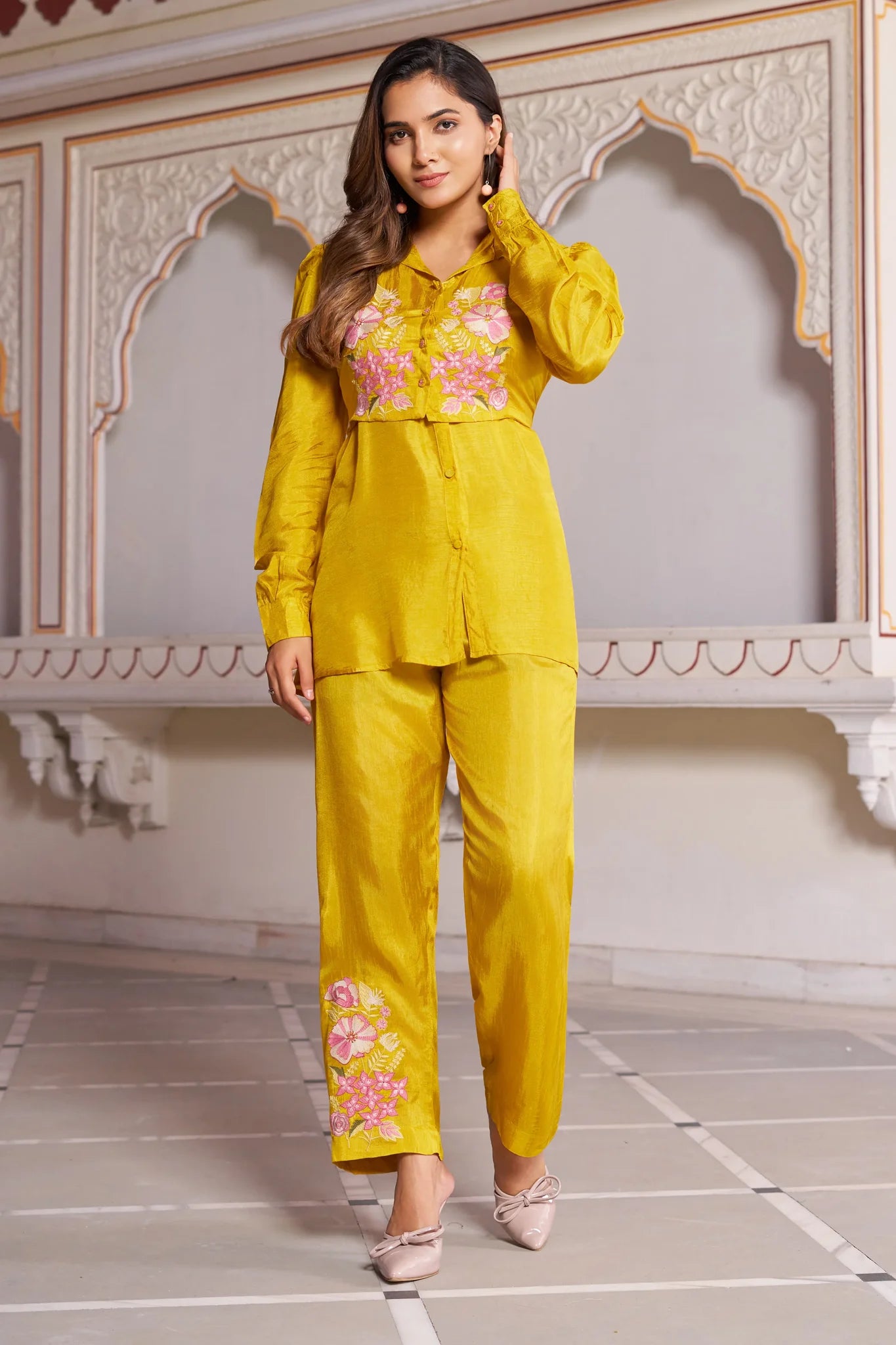 Golden Bloom: Mustard Embroidered 3-Piece Set in Dola Silk
