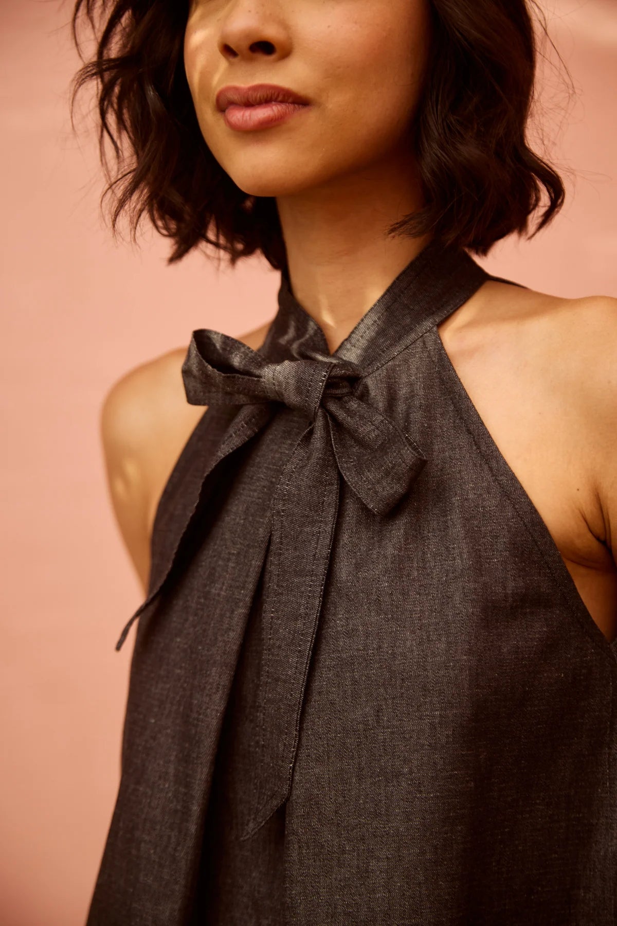 This stylish Nomad denim coord set features a feminine bow detail at the neck and sleek topstitching on both the top and pants for a polished finish. The wide-leg flared pants offer a relaxed yet flattering fit, while the back boasts an antique brass button closure for a vintage touch. Perfect for dressing up or down, this set combines comfort and chic elegance for a versatile, timeless look.