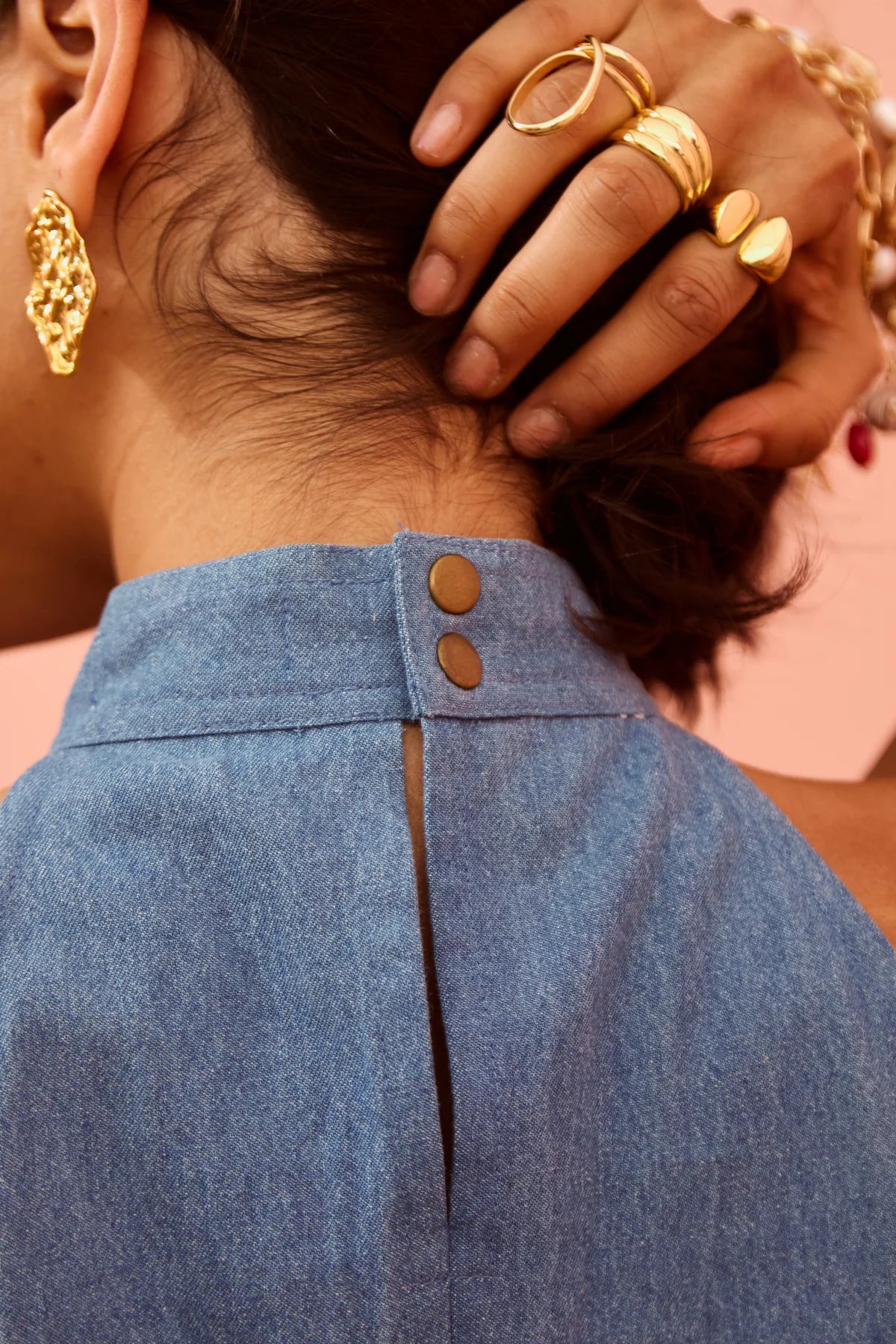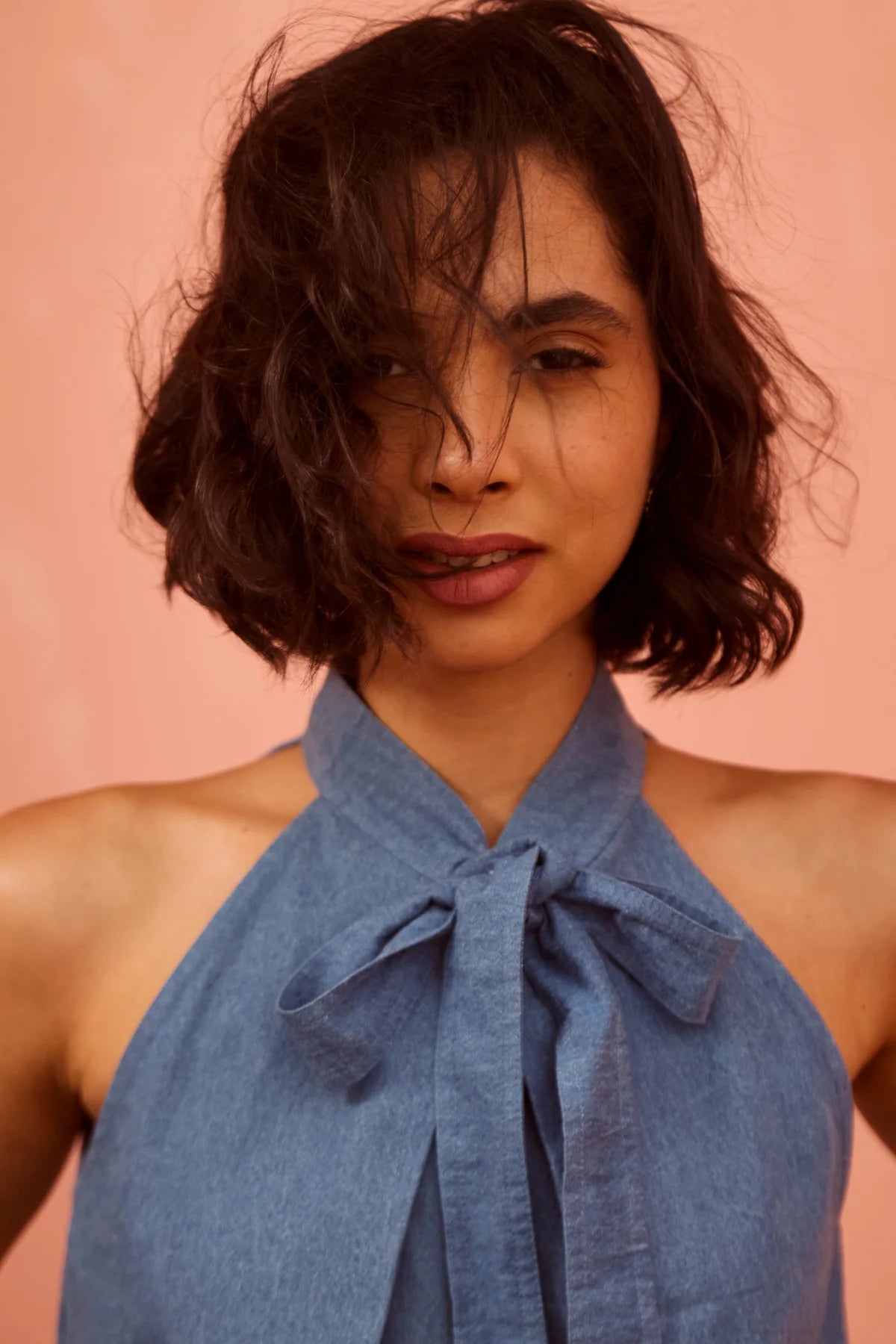This stylish Nomad denim coord set features a feminine bow detail at the neck and sleek topstitching on both the top and pants for a polished finish. The wide-leg flared pants offer a relaxed yet flattering fit, while the back boasts an antique brass button closure for a vintage touch. Perfect for dressing up or down, this set combines comfort and chic elegance for a versatile, timeless look.