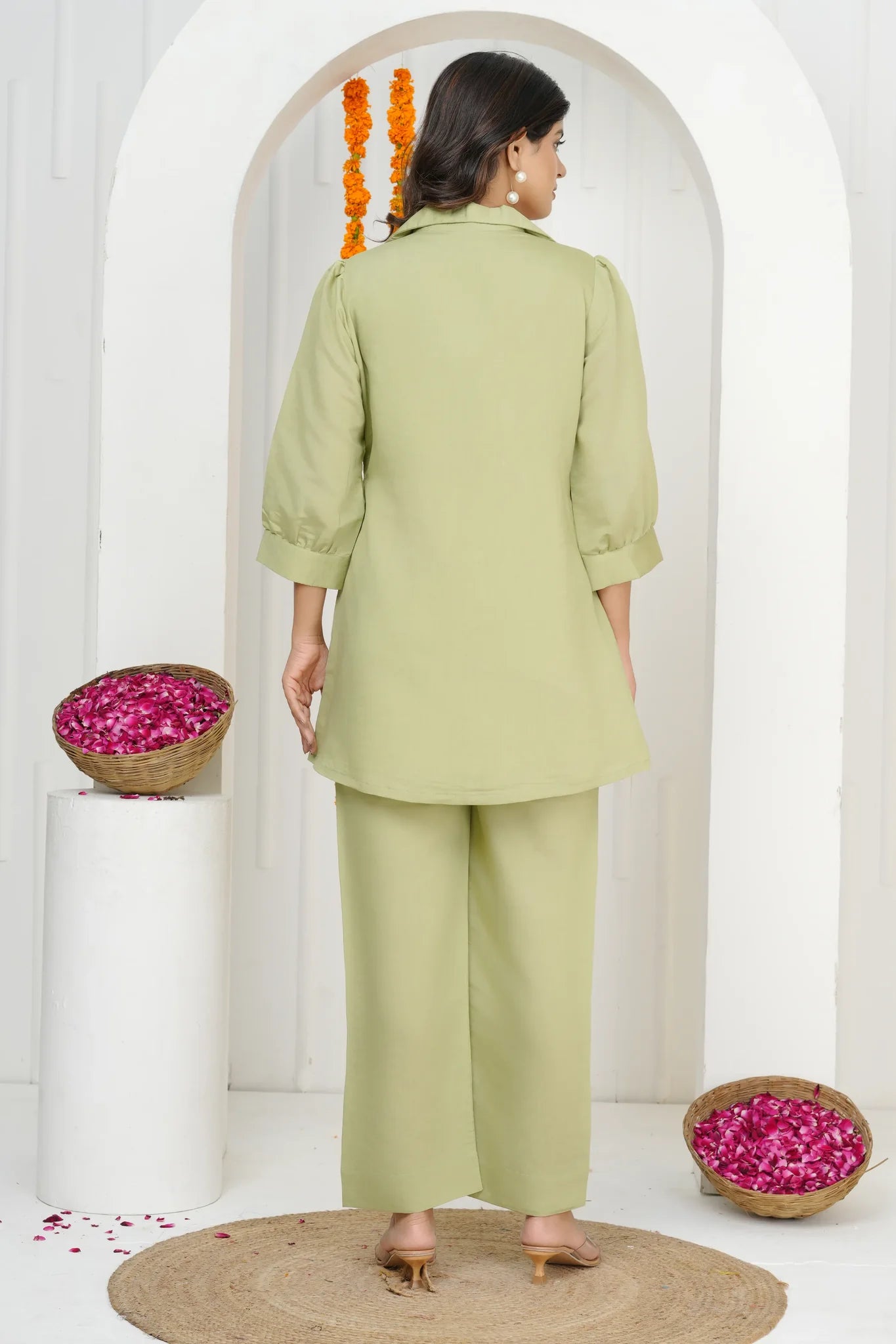 Infuse your wardrobe with refreshing elegance through this pista green co-ord set, designed in smooth Roman silk. Embodying artisanal embroidery and modern tailoring, it’s a statement of effortless grace—ideal for festive luncheons, cultural evenings, or elevated daywear.