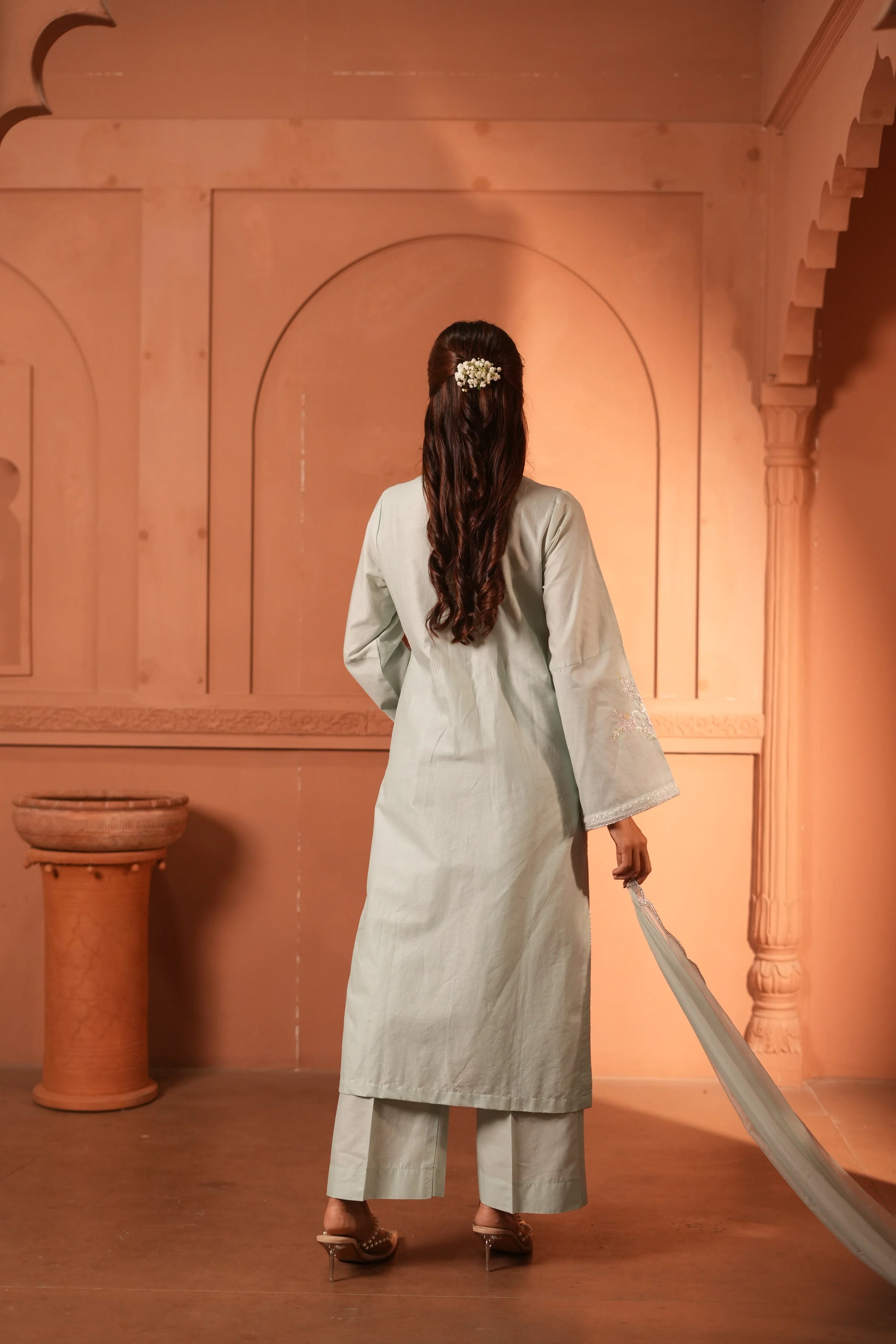 DESCRIPTION: This elegant outfit features a pastel blue three-piece set consisting of a straight kurta, matching palazzo pants, and a sheer dupatta. The kurta is designed with a V-neckline adorned with subtle sequin detailing and delicate floral embroidery in soft pastel shades along the front and sleeves. The sleeves are three-quarter length with a relaxed, slightly flared cut. The light, airy fabric gives the ensemble a graceful flow, perfect for daytime festive events or elegant casual wear. The overall look is minimal, refined, and effortlessly chic.