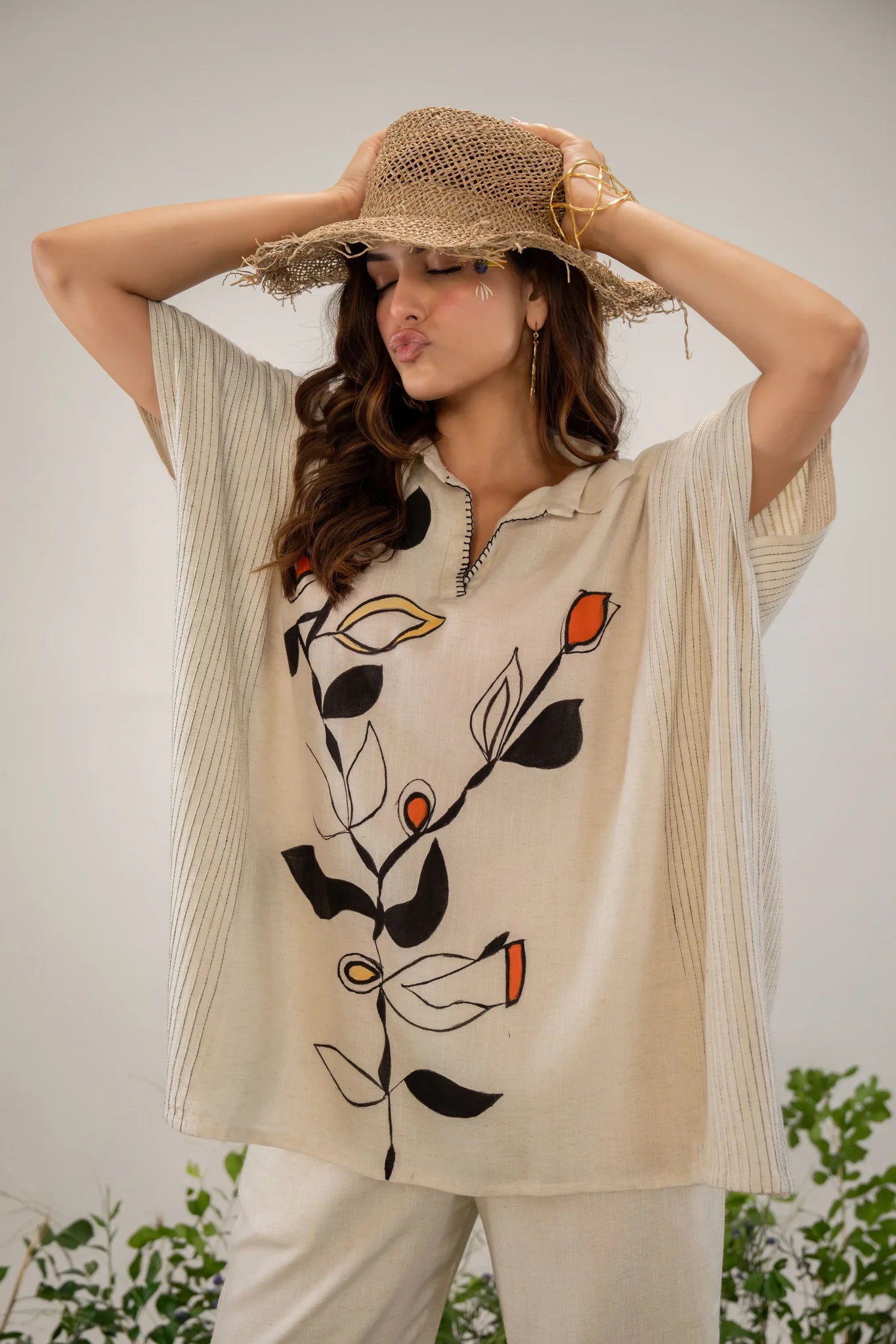 Solid Cream Printed Kaftan Style Co-Ord Set in Linen Slub